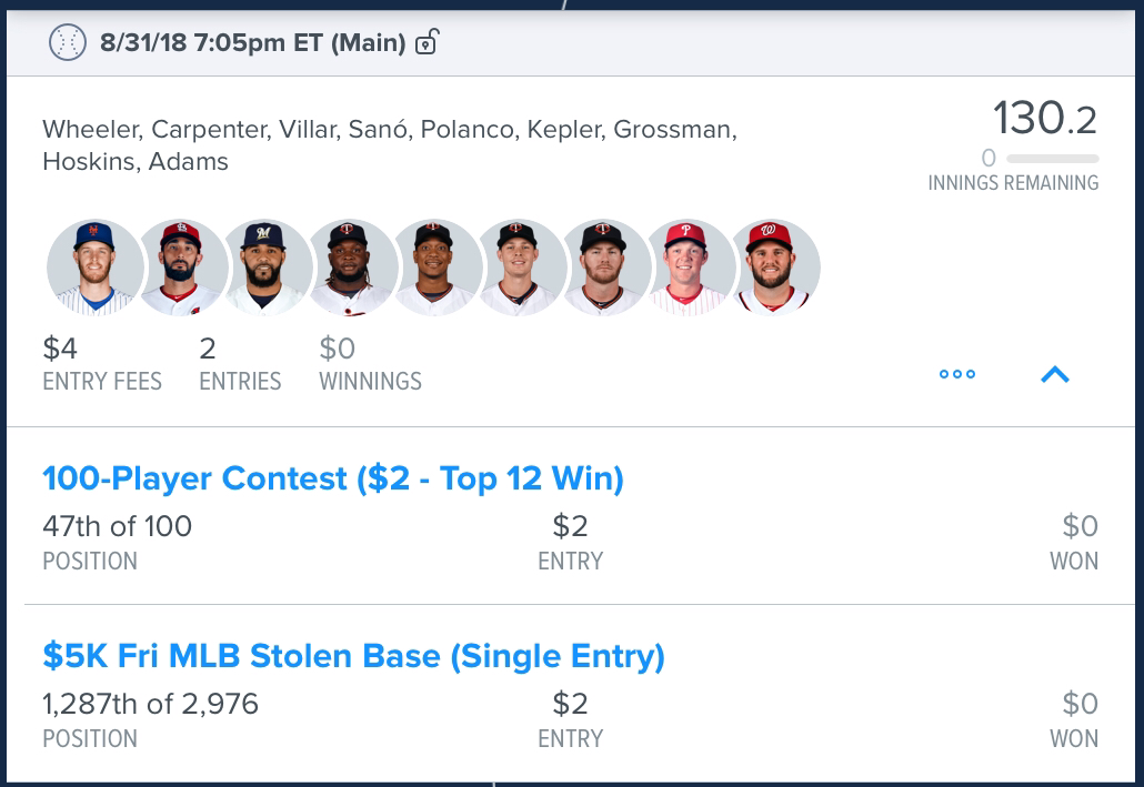 Hoskins and Villar got me a total of 3 FD points, which torpedoed any chance my lineup had for cashing. Perhaps I could have found a better combination of players to go along with the Twins stack and pair of Cardinals. Looking back the data wasn’t as promising for Hoskins as I assumed it would be, though I think $3500 is still a good price for that upside. The data suggested that Villar was a poor choice and I should have spent more time researching the options at 2B.