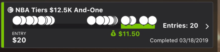 Tier 4 – Siakam 60% / Nurkic 20% / Levine 20%: The quest for the nuts ended on this tier as Derozen outscored everyone else by at least 11 points. Derozen was 20% owned in the tournament so it was a difficult task to make up that ground against those lineups. I liked Siakam with Kawhi, Lowry, and Ibaka out as his usage would be much higher and I hoped the game would stay close. Then Lowry was ruled in. I still liked Siakam, but looking back perhaps I should have pivoted off him. At that time I was at work with a client, so it would have had to been a global swap. I decided to keep what I had. If I was at home in front of my computer I might have adjusted, but that wasn’t a possibility yesterday. As I continue to play and learn I will get better at adjusting these lineups on the fly.
